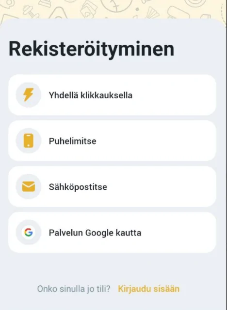 Jos sinulla on jo tili, kirjaudu sisään käyttäjätunnuksellasi ja salasanallasi. Voit myös kirjautua sisään tekstiviestillä tai sosiaalisen median kautta.